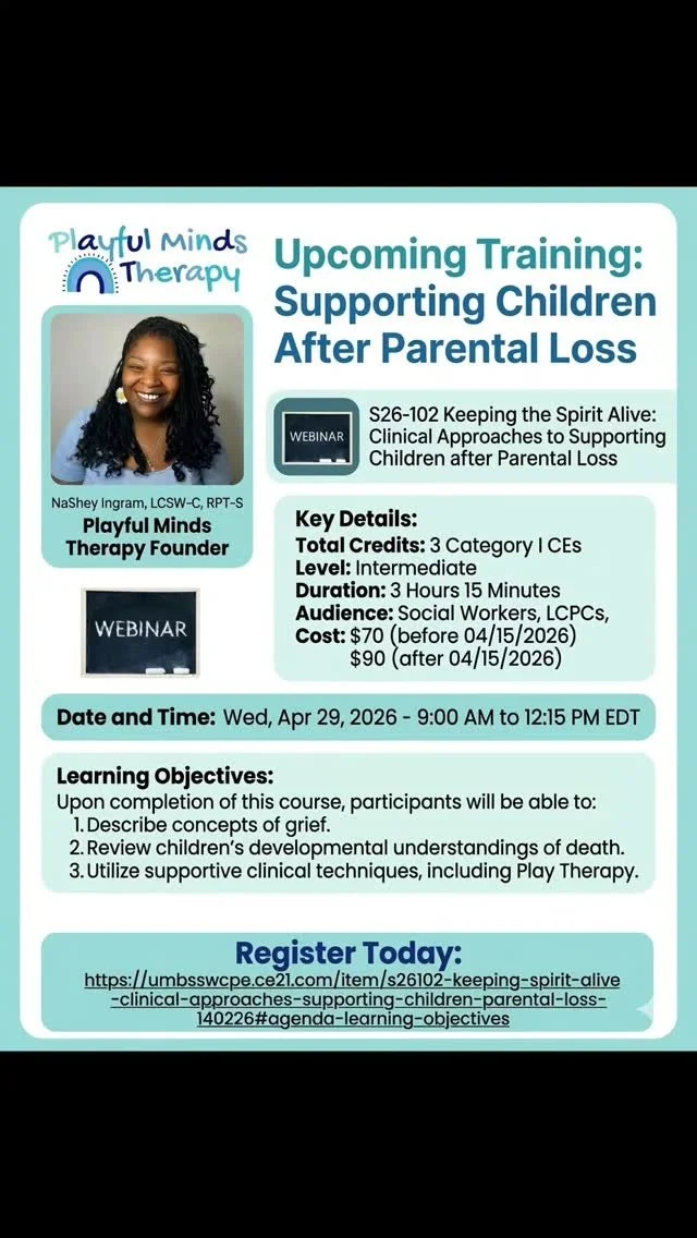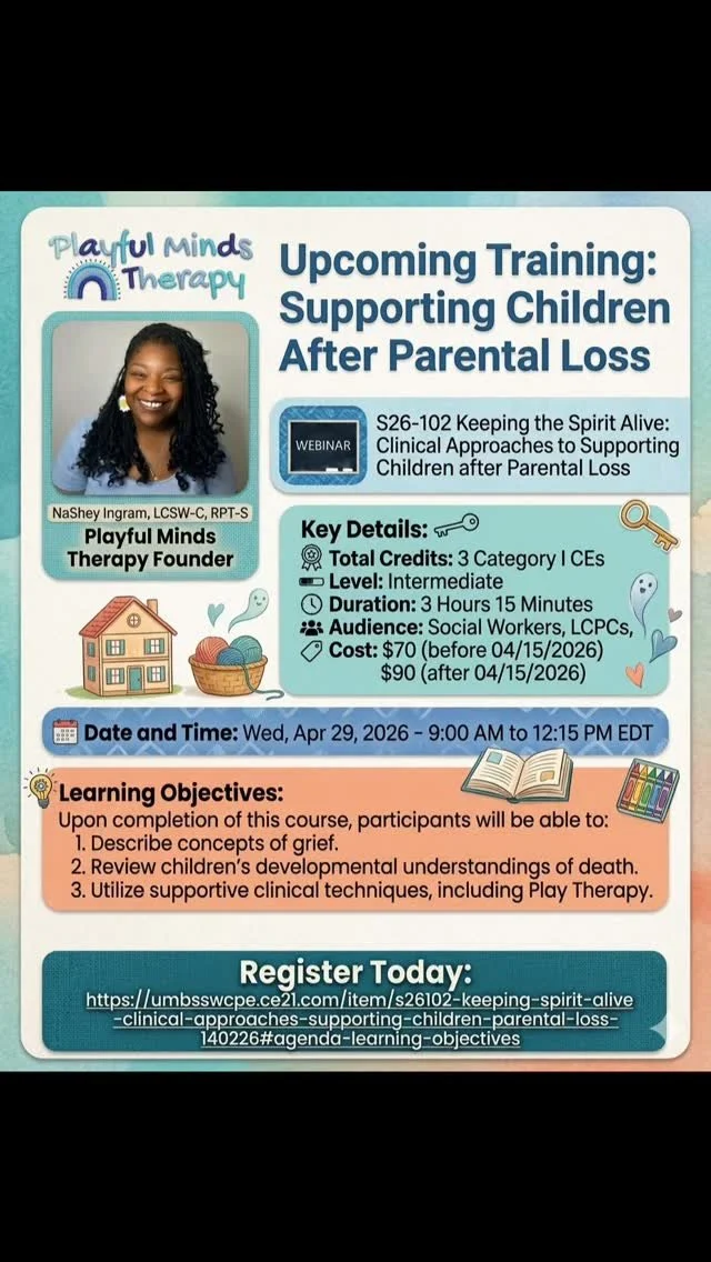 We also provide trainings and workshops designed to deepen your understanding of play therapy and culturally responsive care, helping you integrate these practices into your work with children and families.